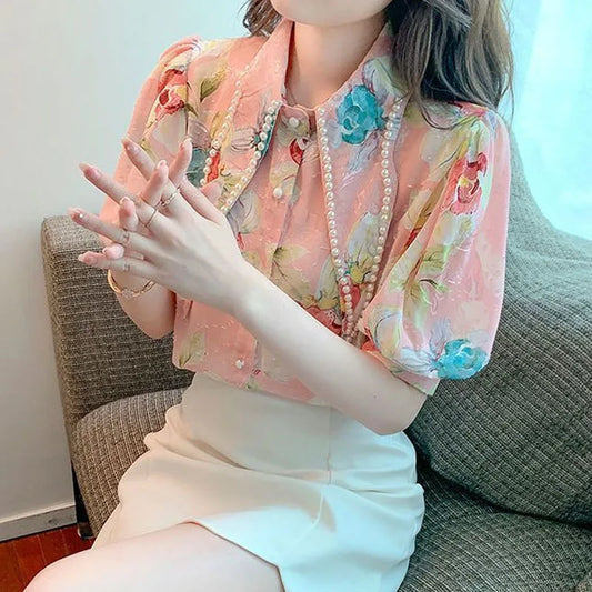 Letizia® | Elegant Casual Set Of Half-Sleeved V-Neck Printed Blouse And Wide-Leg Pants
